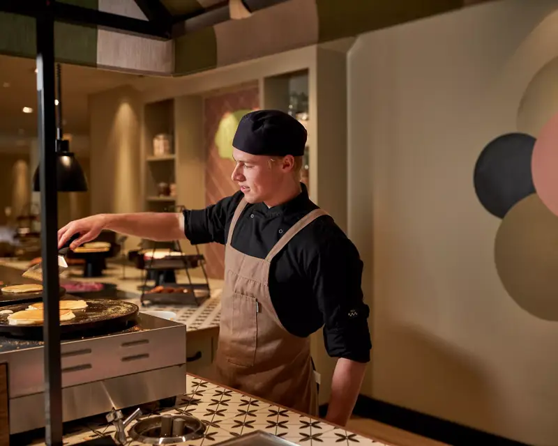 Every Sunday, we are happy to welcome the whole family back to our buffet restaurant with luxurious open kitchen. You have a wide choice of tasty starters, salads, main courses and desserts. There is also plenty of choice for the children with chips, snacks and they can bake their own biscuits.