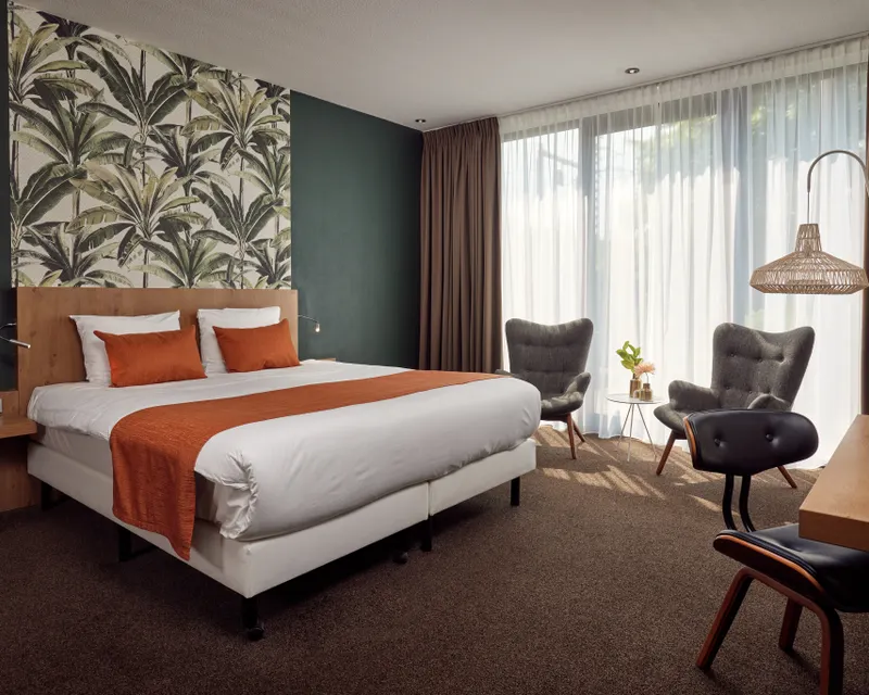 Enjoy a luxurious stay in our Deluxe King Room of 31 m², located in the tranquil annex of the hotel. The room is elegantly furnished and features a spacious king-size bed for a restful night's sleep. The modern bathroom includes both a shower and a separate bathtub, perfect for a relaxing moment. With the annex location, you will benefit from extra privacy and a serene setting, ideal for both business travelers and holiday guests. Experience comfort and luxury at its best at Van der Valk Hotel Breukelen. The deluxe rooms do not have a balcony or terrace. If you would like a terrace, you can book a superior room.