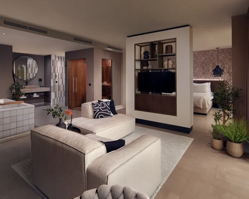Experience the relaxed and sun-kissed atmosphere of the Ibiza Suite, a spacious 70 m² hotel suite where comfort, tranquillity and luxury come together. The interior is inspired by the iconic Ibiza style, featuring warm colours, natural materials and decorative accents that instantly create a holiday vibe.