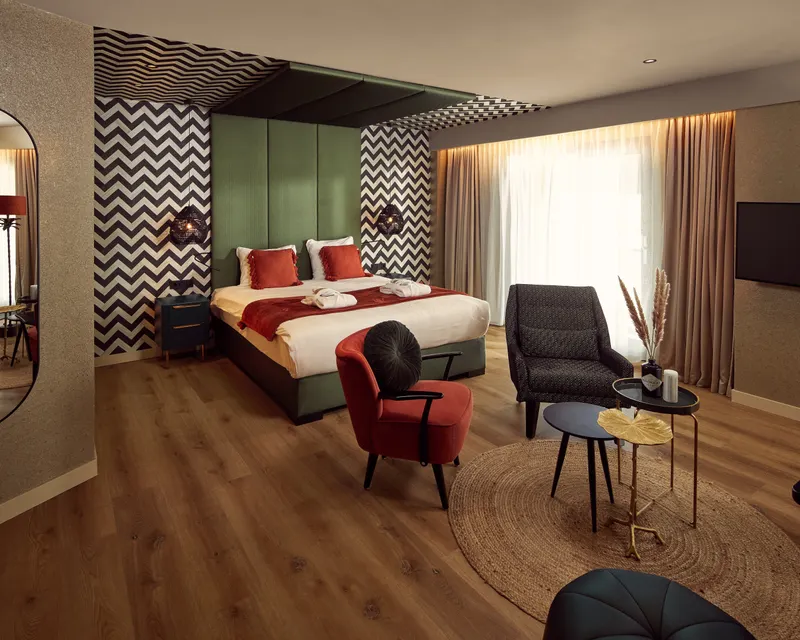 Escape the everyday and unwind in the Oslo Suite, a serene oasis of comfort and elegance. Stylishly furnished with warm details and luxurious amenities, this suite invites you to relax completely. The semi-open bathroom features a whirlpool bath and a separate double rain shower, perfect for indulging both body and mind.