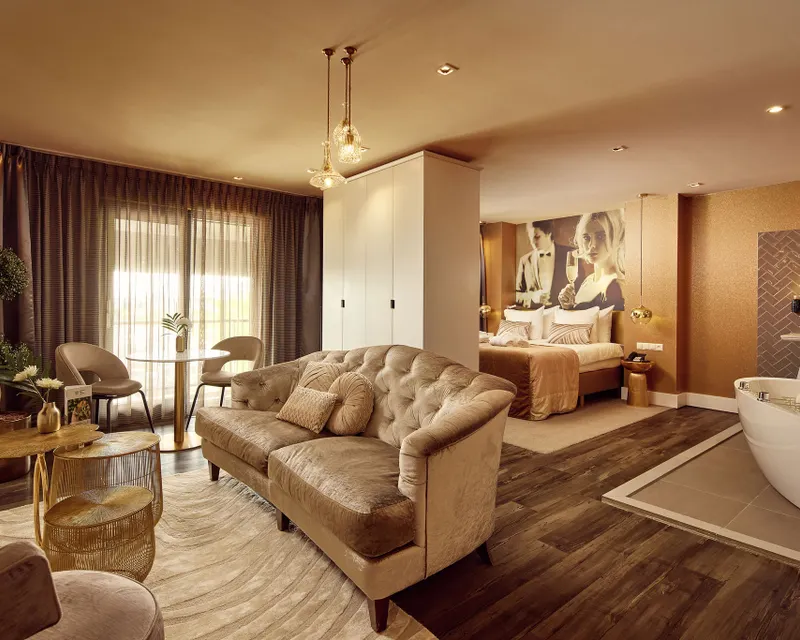 Ervaar de elegantie en allure van onze Monte Carlo Suite, geïnspireerd op de glamoureuze sfeer van de beroemde Franse Rivièra. Deze suite combineert stijlvolle inrichting met een warm, luxe gevoel waarin u meteen tot rust komt.